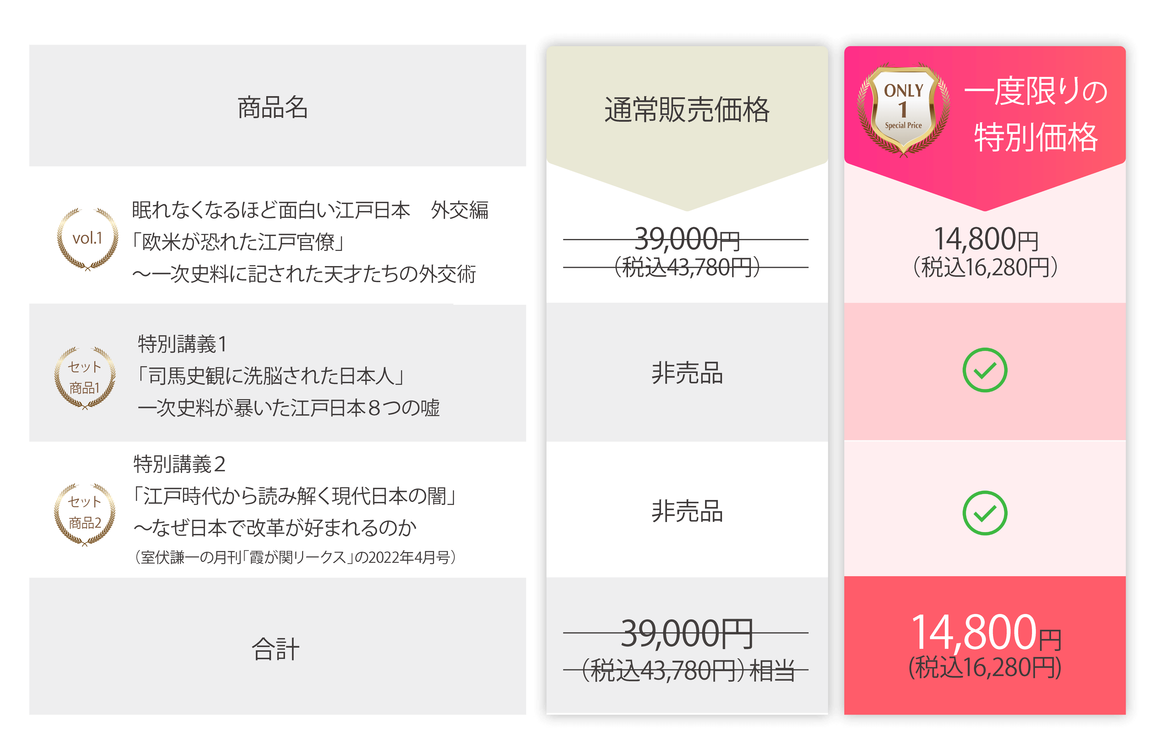 まだ講座が完成しておらず、5月下旬の提供を予定していることからも、予約販売価格として大幅に値引きいたします。5月3日(火)23:59までの期間限定ではありますが、通常販売価格から25,000円を割り引いた、14,800円(税込16,280円)の特別価格でご提供させていただきます。