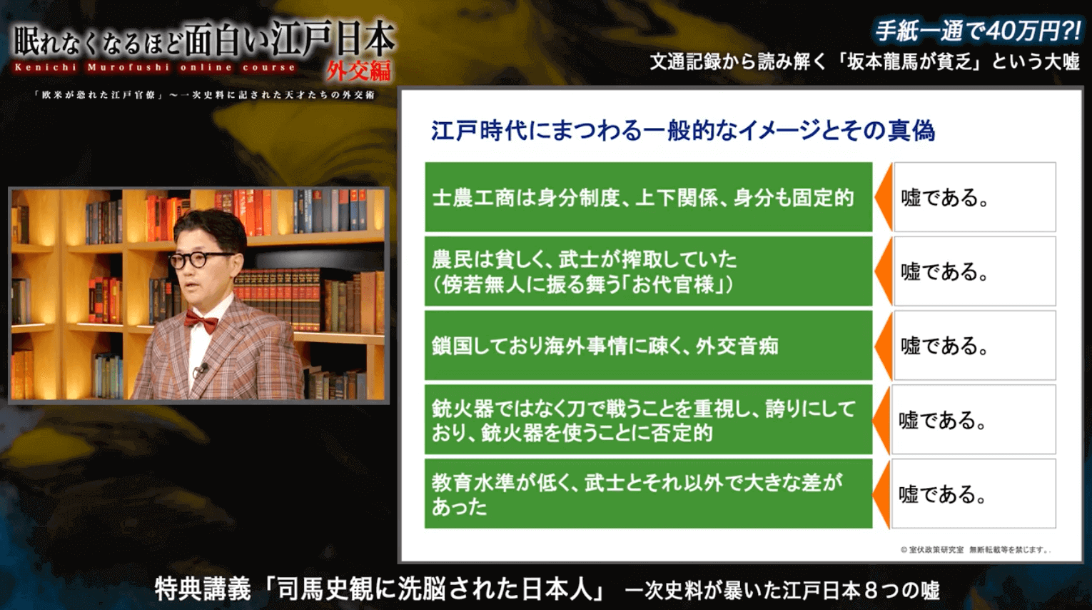 この講座では、室伏謙一があなたの代わりに、一連のリサーチ・分析を行ってくれていると考えてください。 正直に言うと、小中高の96.5%の教科書ですら嘘が教えられているので、(出典:歴史教科書「ペリー来航」像の虚実を問う:米側史料「日本遠征」の過剰と日本側史料「墨夷応接録』の不在)一体何が嘘で、何が史実か?を正確に見極めることはとても難しいです。さらに、高い授業料を払って受講する大学の講義でも、江戸時代と現代を、政官財での内部の経験を踏まえて多角的に分析するという、高度な視点から講義を受けることはできません。 つまり、それほど価値のある希少な内容ということです。